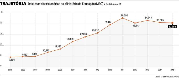 Em relação a 2014, quando a União investiu R$ 12 bilhões, o corte chega a 66%. Por outro lado, a previsão para os gastos de custeio do sistema educacional (administração, manutenção de programas já existentes, salários e aposentadorias dos servidores) é ascendente.