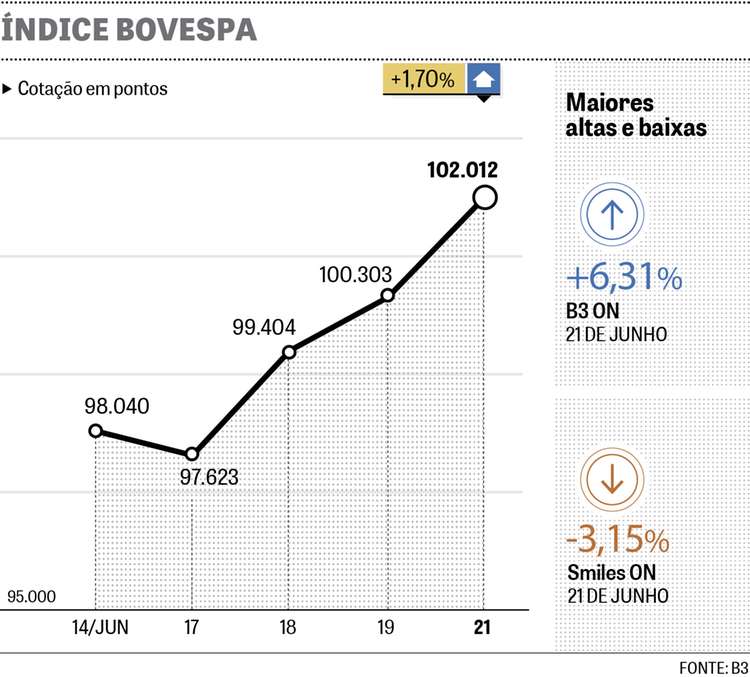 O Ibovespa fechou em alta de 1,70%, aos 102.012,64 pontos. Na B3, o volume de negócios desta sexta foi de R$ 18,6 bilhões, considerado bom entre um feriado e um fim de semana, normalmente marcado por fraca liquidez.