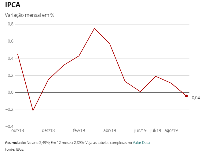Link: https://valor.globo.com/brasil/noticia/2019/10/09/ipca-recua-004percent-e-registra-menor-taxa-para-setembro-desde-1998.ghtml. Acessado em: 09 Outubro 2019, 09:52:44.
