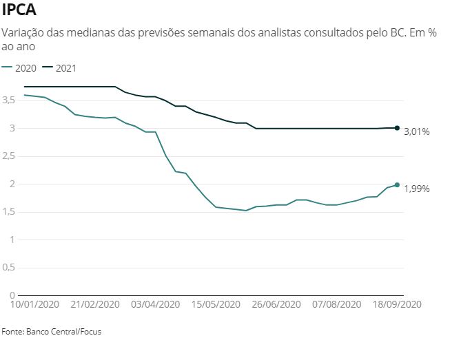 Para 2021, o ponto-médio das expectativas manteve-se em 3,50%, com algumas casas apostando na recuperação de parte das perdas deste ano no próximo.