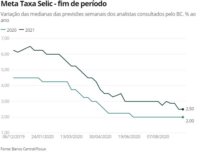 Para 2021, a projeção para a Selic permaneceu em 2,50% ao ano entre os economistas em geral e 2,00% ao ano entre os campeões de acertos.