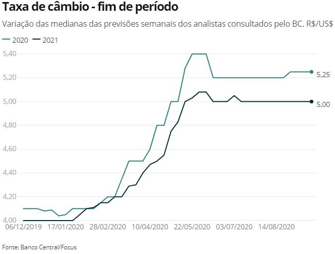 Entre os economistas em geral, a expectativa permaneceu em R$ 5,25 para o fim de 2020 e R$ 5,00 no encerramento de 2021.