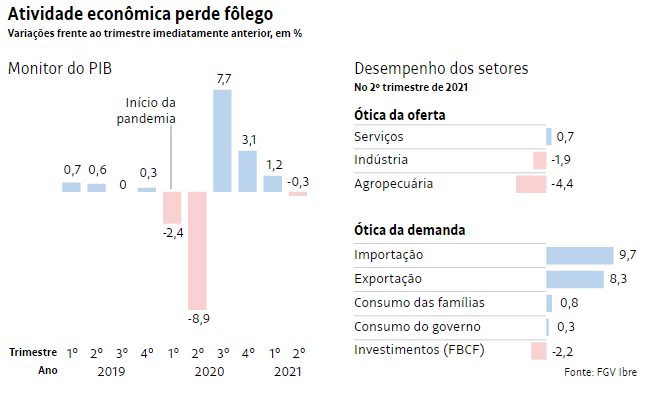 fonte: https://www1.folha.uol.com.br/mercado/2021/08/retomada-perde-forca-e-atividade-encolhe-03-no-segundo-trimestre-diz-monitor-do-pib-da-fgv.shtml acessado em 17/08/2021.
