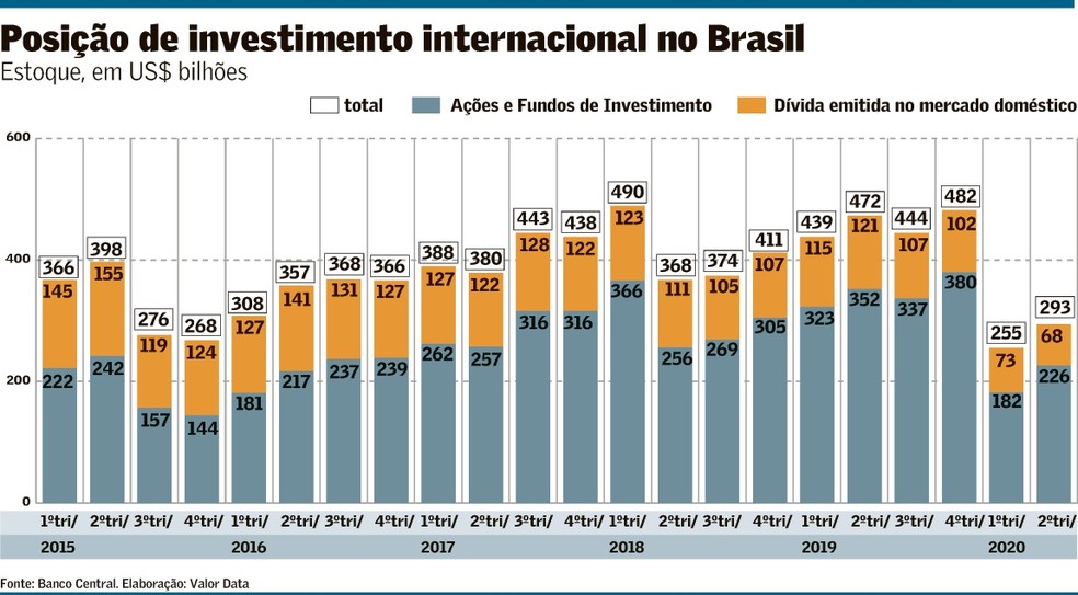 Assim, o estoque de capital estrangeiro em portfólio no Brasil caiu para US$ 293 bilhões no fim de junho, segundo dados do Banco Central. Também houve uma melhora em relação aos R$ 255 bilhões registrados no fim de março. No entanto, ele continua no menor nível desde o segundo trimestre de 2015.